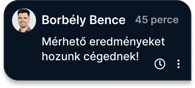 A te igényeid szerinti rendszerességgel egyeztetünk a kampányok eredményeiről. Az iparágadban egyre jobban elmélyülve támogatjuk vállalkozásod. A marketing mellett egy üzleti partnert is kapsz.
