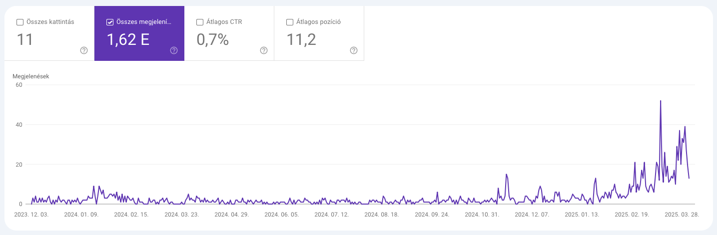 Ügyfelünk webáruházában az egyik márka termékei szinte meg sem jelentek a Google-ben. Január végére 110 termék esetén elkészítettük a SEO címek és leírások ráncfelvarrását. Látható, hogy már pusztán ez a fejlesztés milyen irányba löki a megjelenéseket. Ez még nem kattintás, nem eladás, de minden organikus vásárlás megtekintéssel kezdődik.